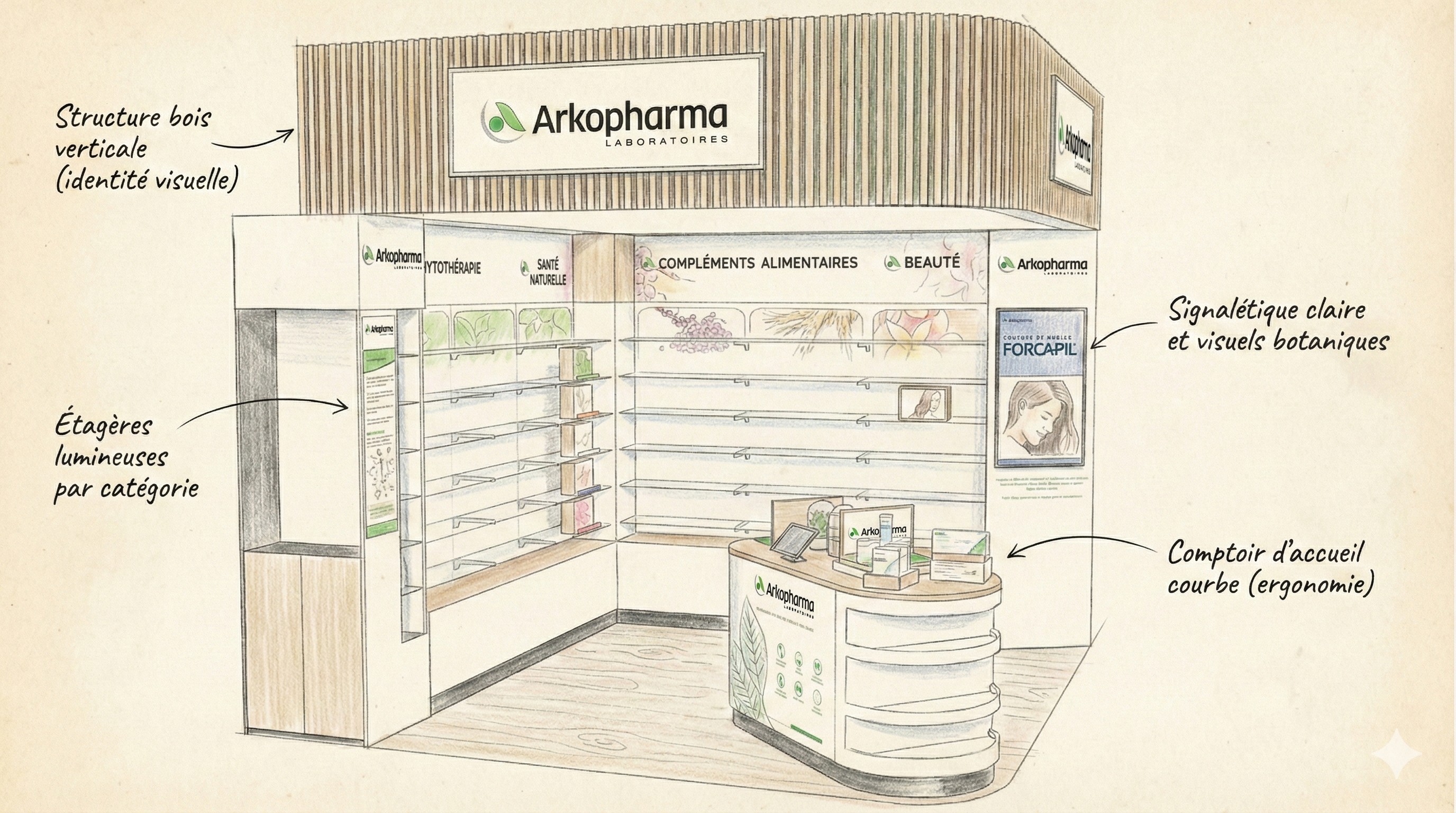 Objectifs : - Segmentation : Clarifier l'offre entre phytothérapie et nutrition sportive. - Visibilité : Utiliser des éléments architecturaux forts (lamelles bois, éclairage LED) pour capter l'attention. - Interactivité : Intégrer des supports digitaux et des zones de test produits.