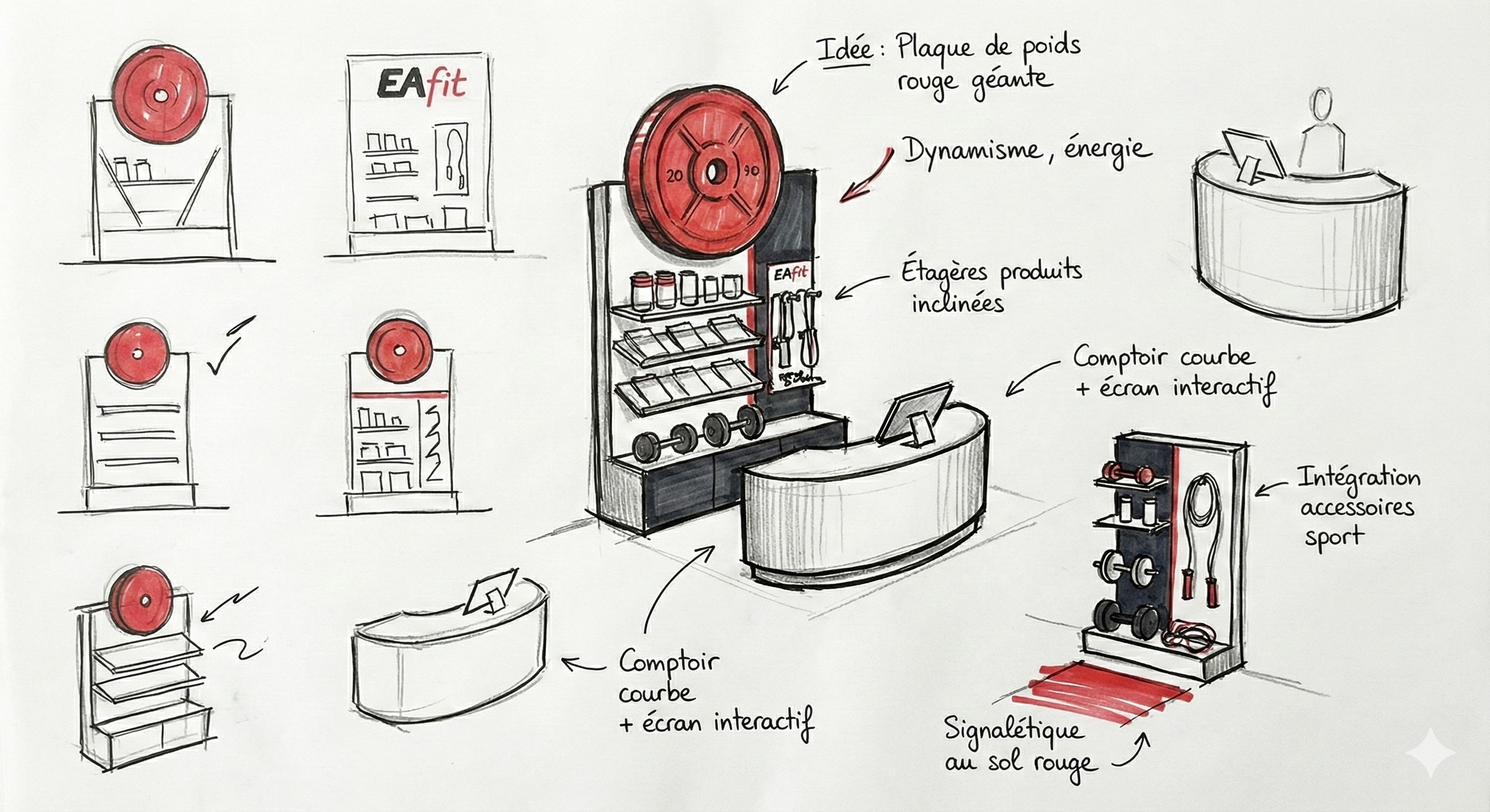 De l'esquisse fonctionnelle au rendu photoréaliste, le processus s'est concentré sur l'ergonomie des comptoirs et la clarté du balisage par catégorie (Beauté, Santé, Coaching).