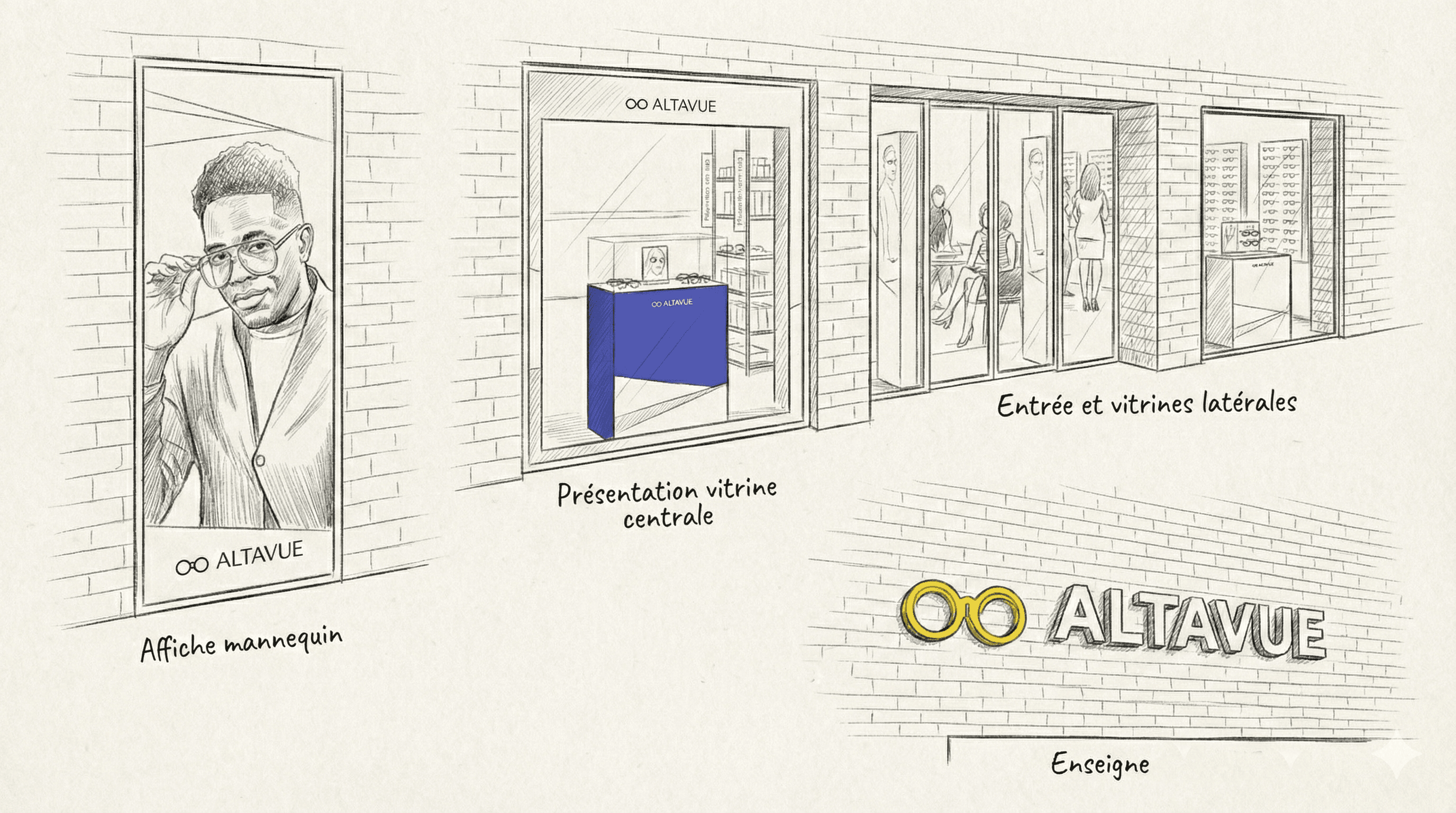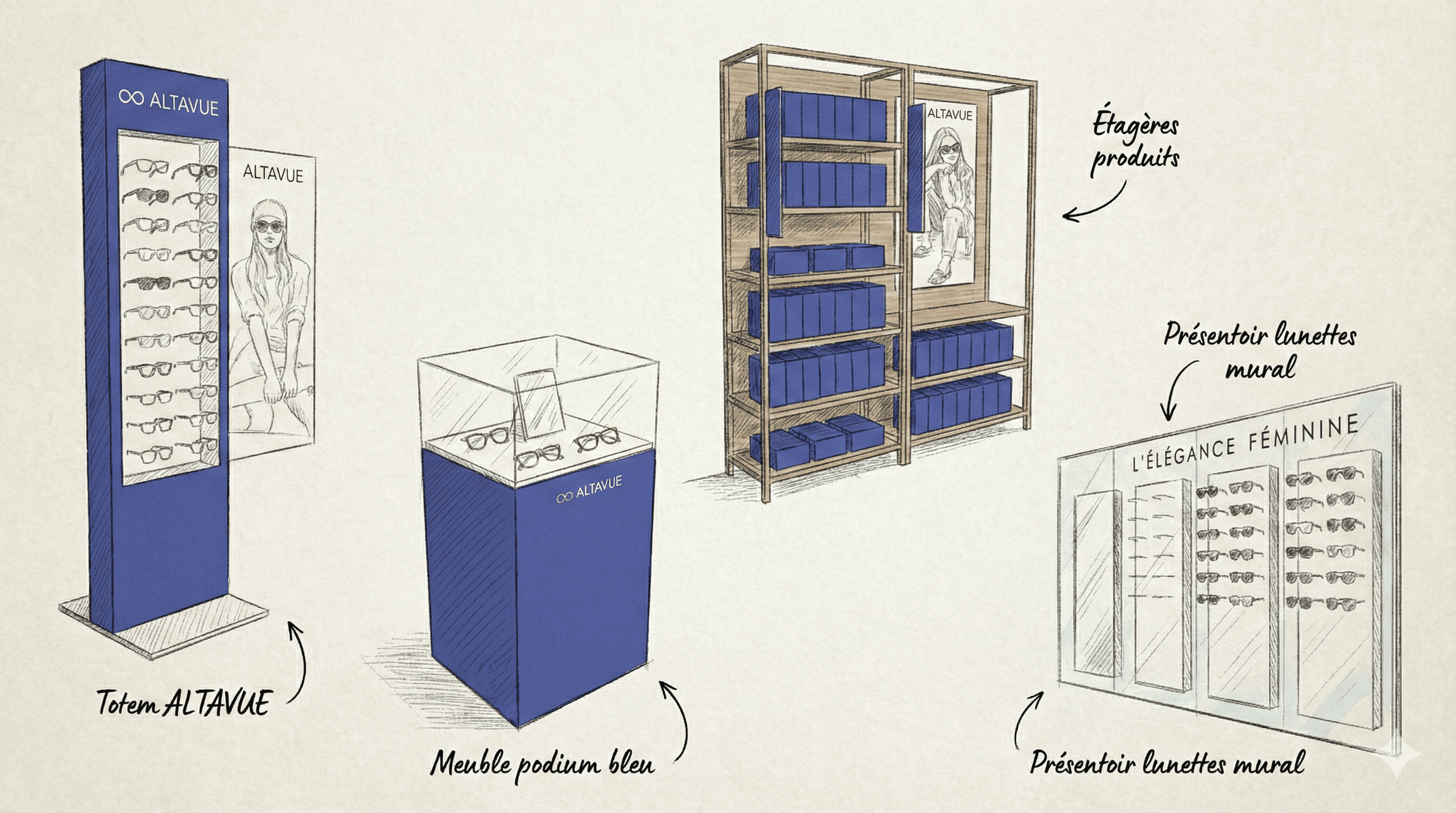 Conception d'un espace de vente virtuel regroupant l'ensemble des solutions PLV de la marque. Cet outil permet aux opticiens de se projeter instantanément dans une configuration réelle et optimisée.